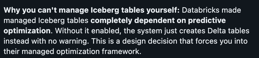 Nearly two years after the acquisition, you can create managed Iceberg tables in Databricks. But you cannot optimize them. You cannot call file compaction. You cannot manage the snapshots. You cannot use hidden partitioning.