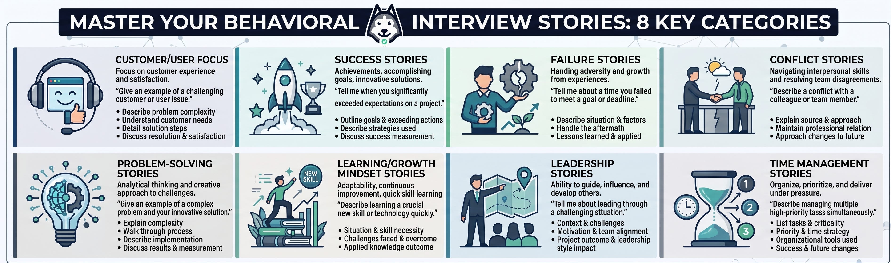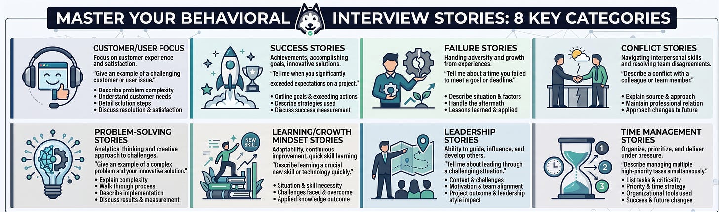 For many engineers, this feels unfair. You’re hired to write code, not to tell stories! But behavioral interviews aren’t going away — they’re getting more important. To streamline your preparation, I’ve organized the questions you’ll face into eight main themes.