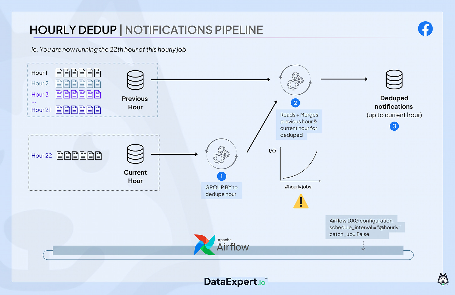 When I joined Facebook, the deduped notifications pipeline ran a giant Hive GROUP BY job once a day at UTC midnight which took 9.5 hours to complete. This latency issue represented a huge bottleneck for all downstream models in the Core Growth team.